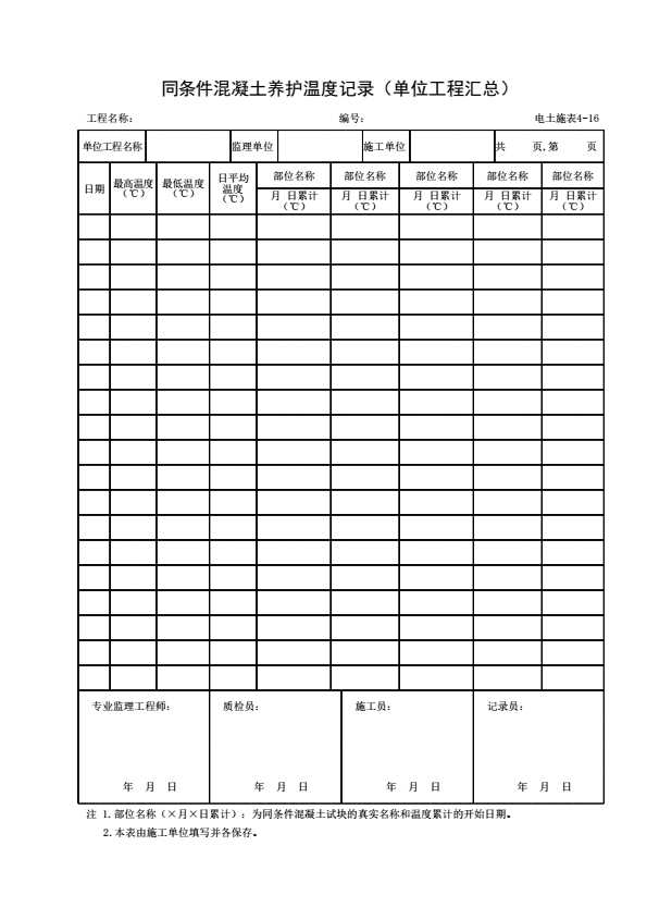 表格名称:电土施表4-16 同条件混凝土养护温度记录(单位工程汇总)