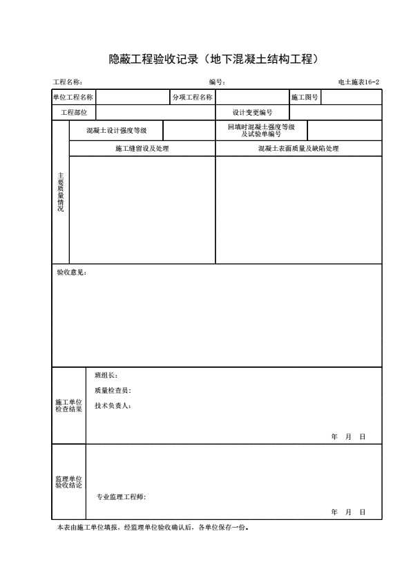 表格名称:电土施表16-2 隐蔽工程验收记录(地下混凝土结构工程)