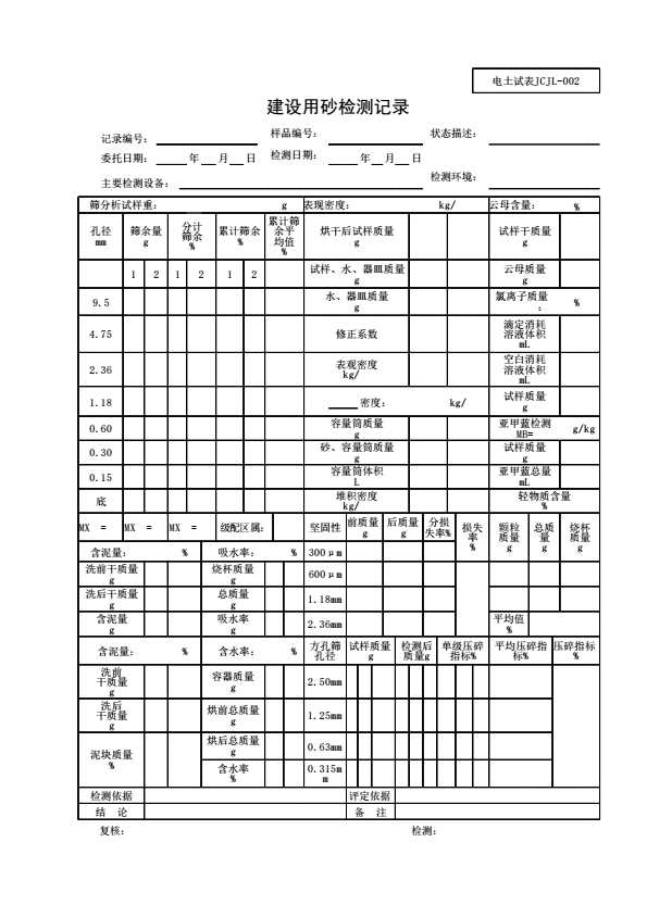 表格名称:电土试表JCJL-002 建设用砂检测记录