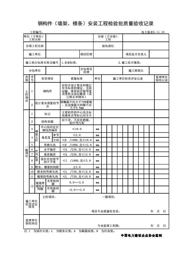 表格名称:电土验表5.11.18 钢结构(墙架、檩条)安装工程检验批质量验收记录