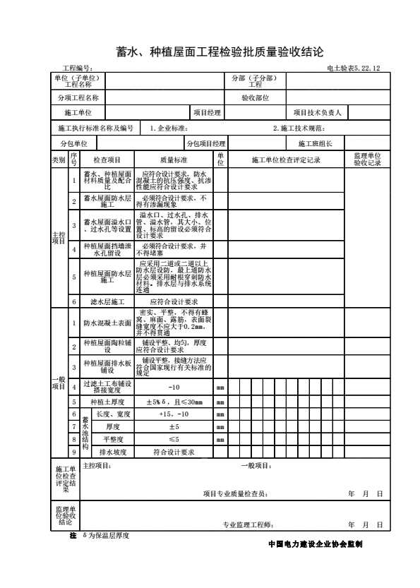 表格名称:电土验表5.22.12 蓄水、种植屋面工程检验批质量验收记录