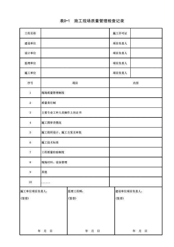 表格名称:表D-1 施工现场质量管理检查记录