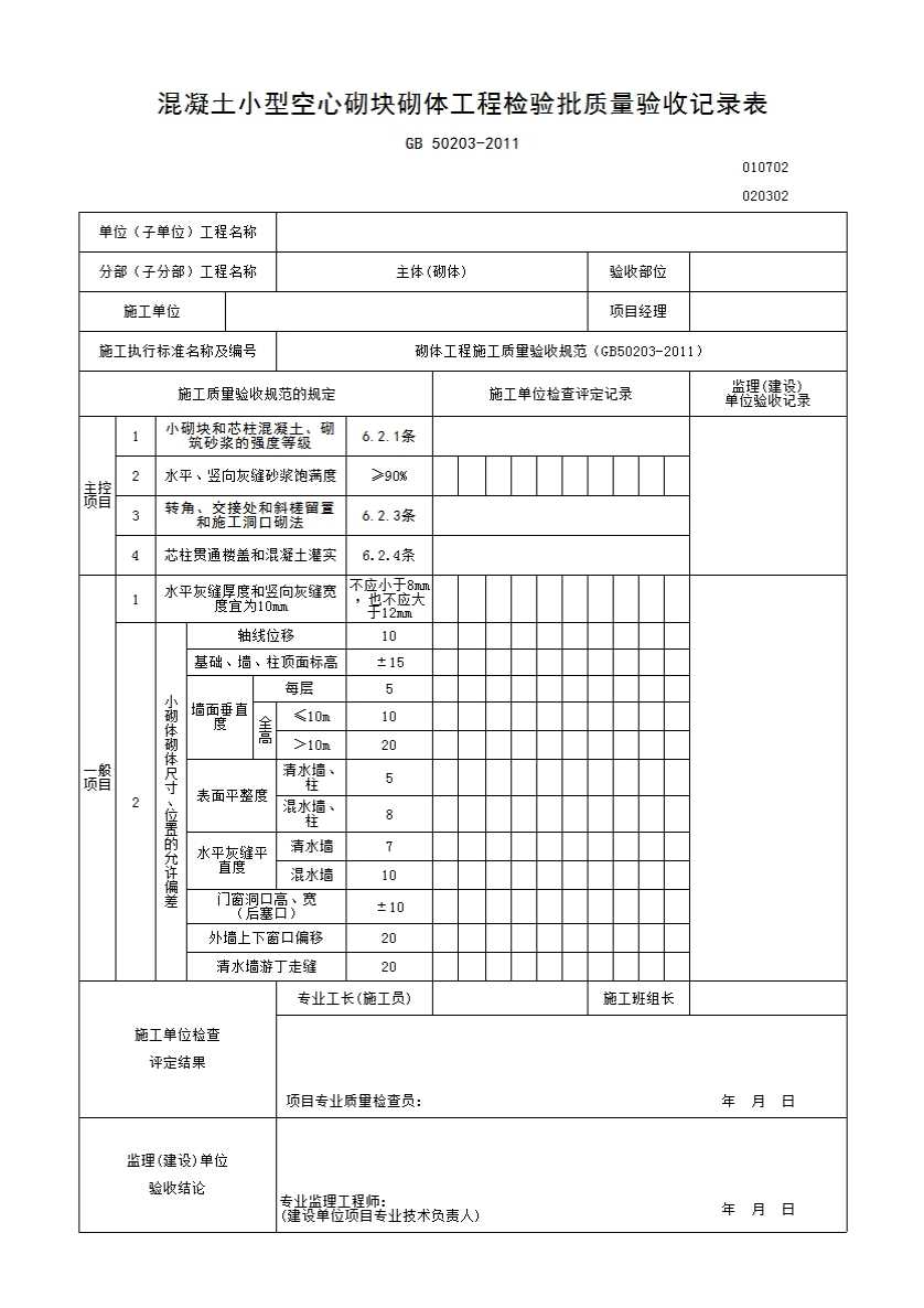 表格名称:混凝土小型空心砌块砌体工程检验批质量验收记录