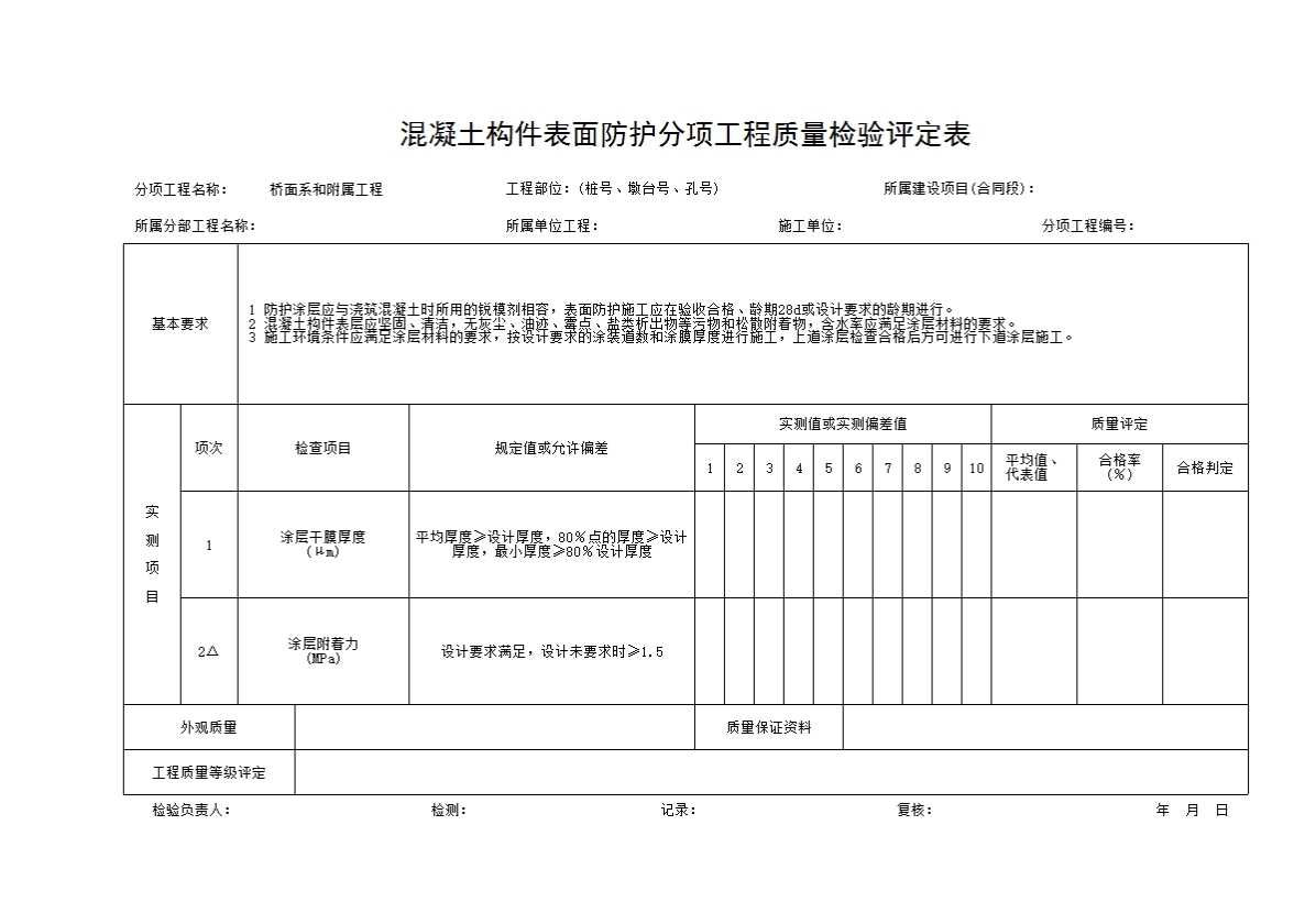 表格名称:混凝土构件表面防护分项工程质量检验评定表