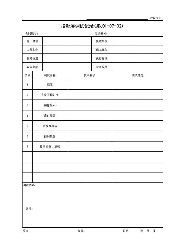 表格名称:投影屏调试记录(JDJ01-07-02)