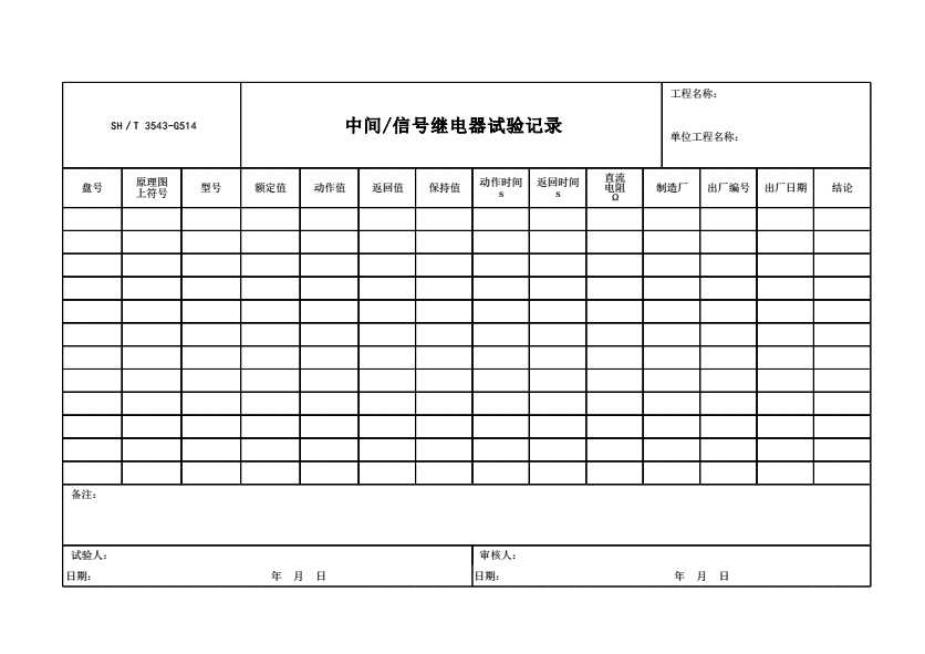 表格名称:SH/T 3543-G514 中间/信号继电器试验记录