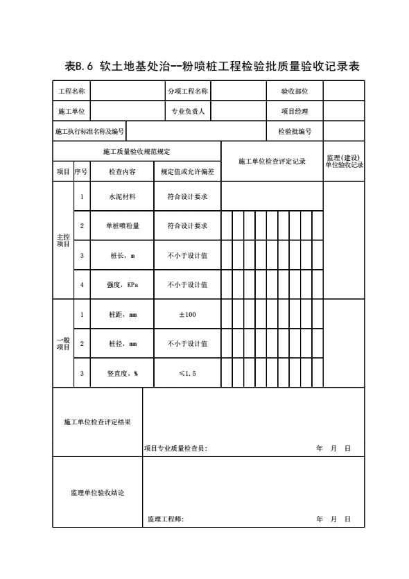 表格名称:表B.6 软土地基处治--粉喷桩工程检验批质量验收记录表