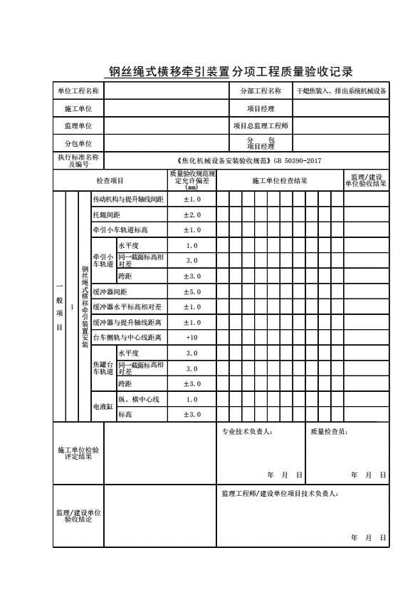 表格名称:钢丝绳式横移牵引装置分项工程质量验收记录
