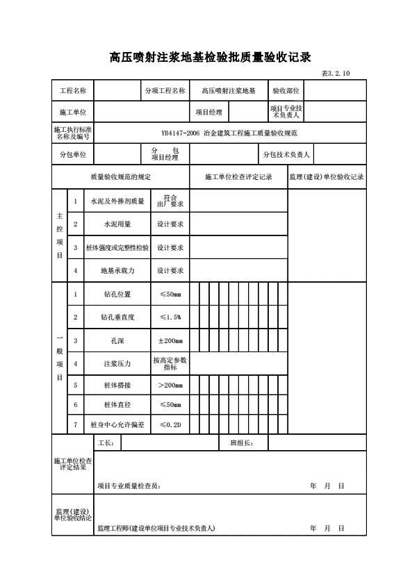 表格名称:表3.2.10 高压喷射注浆地基检验批质量验收记录