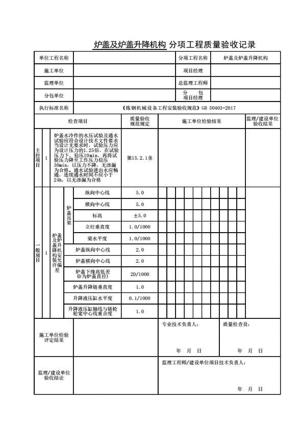 表格名称:炉盖及炉盖升降机构分项工程质量验收记录