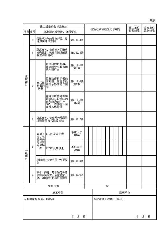表格名称:10010504 隔离开关、负荷开关及高压熔断器检验批质量验收记录表