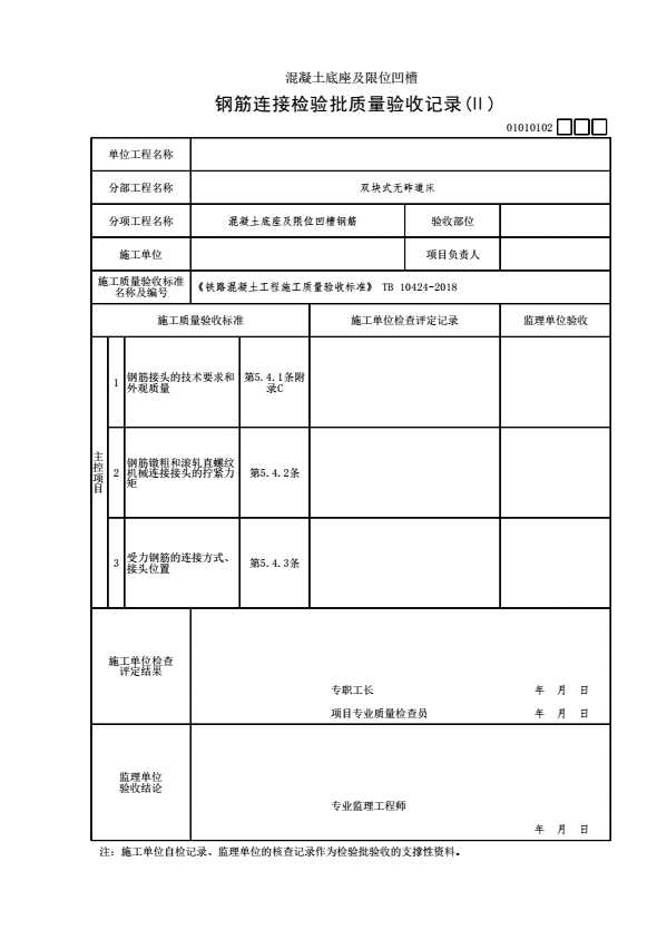 表格名称:01010102 【混凝土底座及限位凹槽】钢筋连接检验批质量验收记录(Ⅱ)