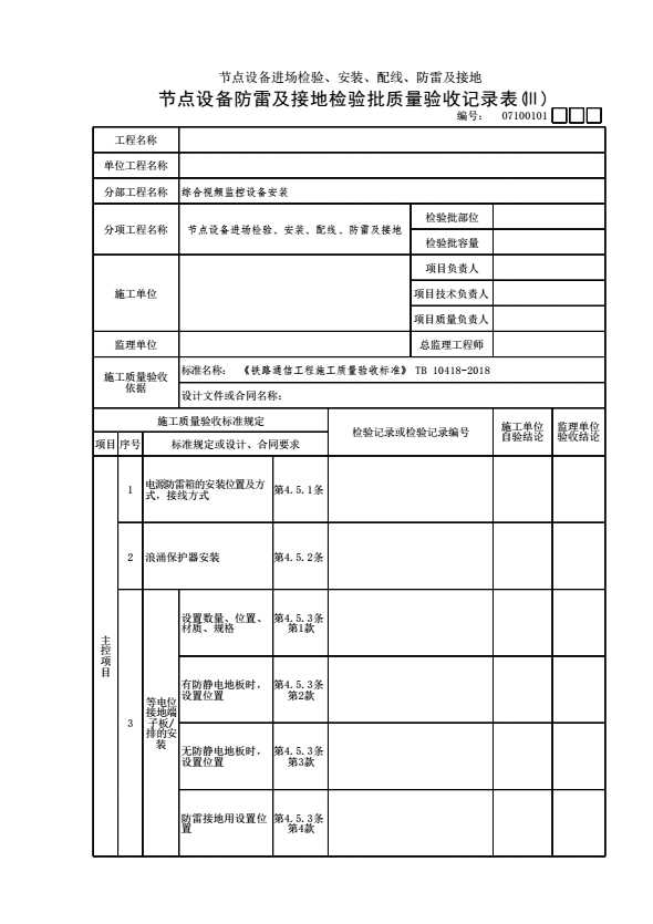 表格名称:07100101 【节点设备进场检验、安装、配线、防雷及接地】节点设备防雷及接地检验批质量验收记录表(Ⅲ)