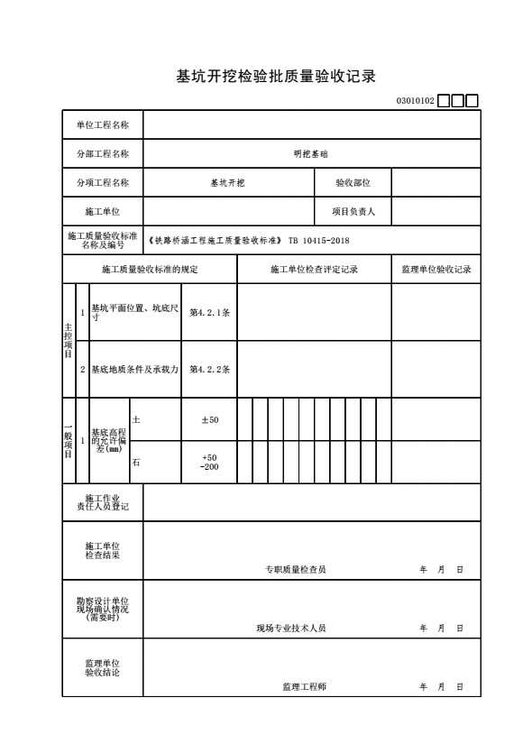 表格名称:03010102 基坑开挖检验批质量验收记录