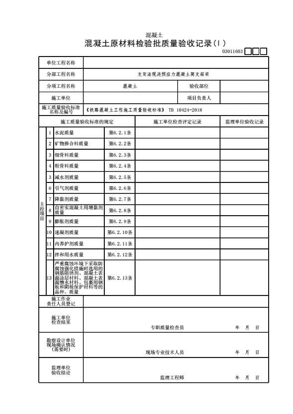 表格名称:03011603 混凝土原材料检验批质量验收记录(Ⅰ)