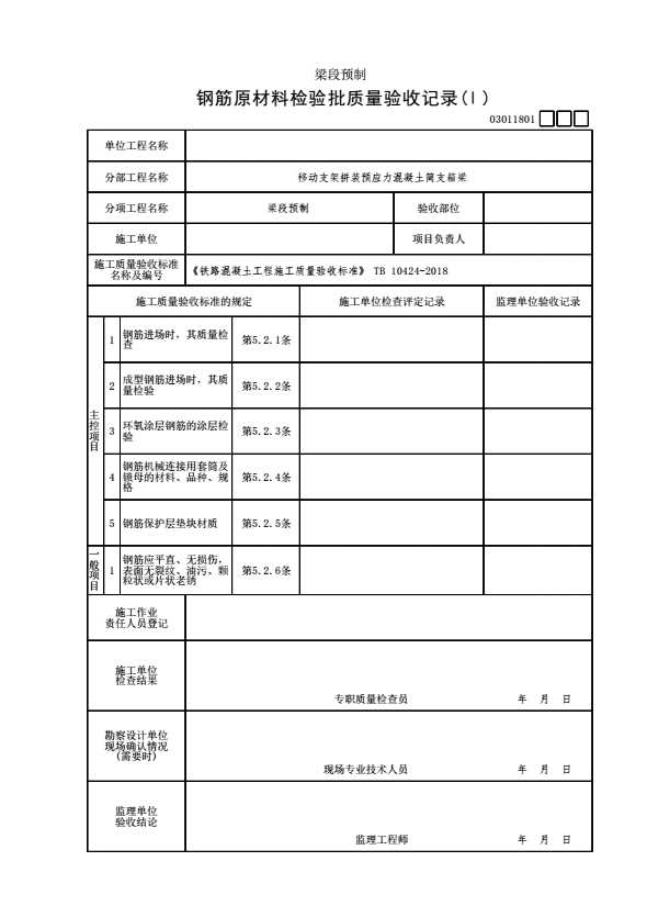 表格名称:03011801 钢筋原材料检验批质量验收记录(Ⅰ)
