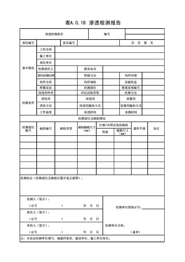 表格名称:表A.0.18 渗透检测报告