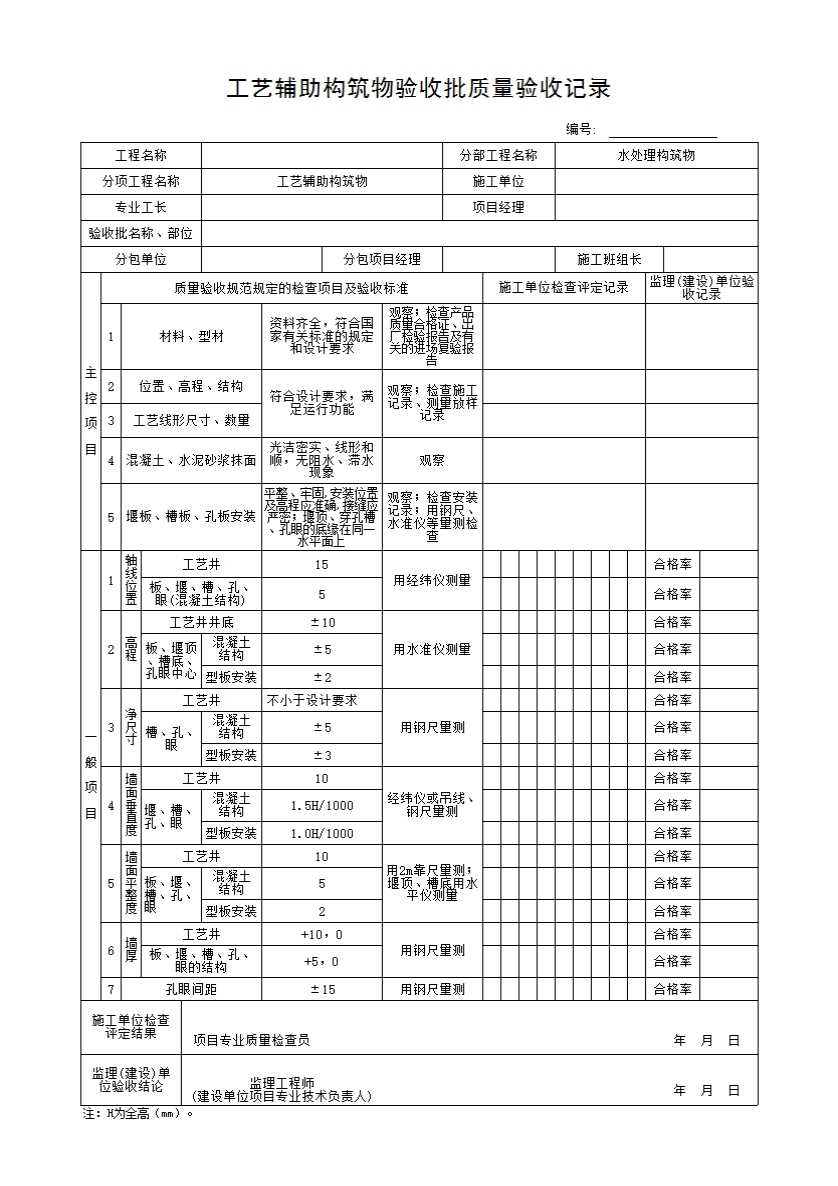6.8.13 水处理工艺的辅助构筑物工程中,涉及钢筋混凝土结构的模板、钢筋、混凝土、构件安装等的质量验收应分别符合本规范第6.8.1—6.8.4条的规定,涉及砖石砌体结构的质量验收应符合本规范第6.8.8条的规定。工艺辅助构筑物的质量验收应符合下列规定: