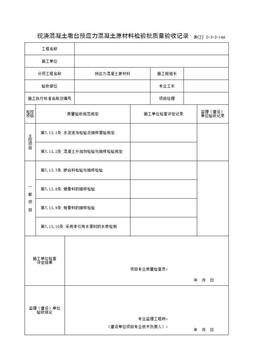 表CJJ2-3-2-14A 现浇混凝土墩台预应力混凝土原材料检验批质量验收记录