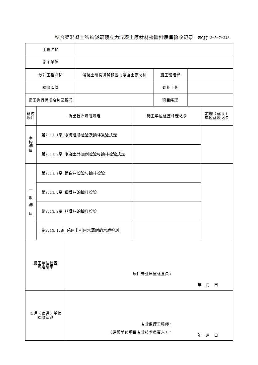 表CJJ 2-8-7-34A 结合梁混凝土结构浇筑预应力混凝土原材料检验批质量验收记录