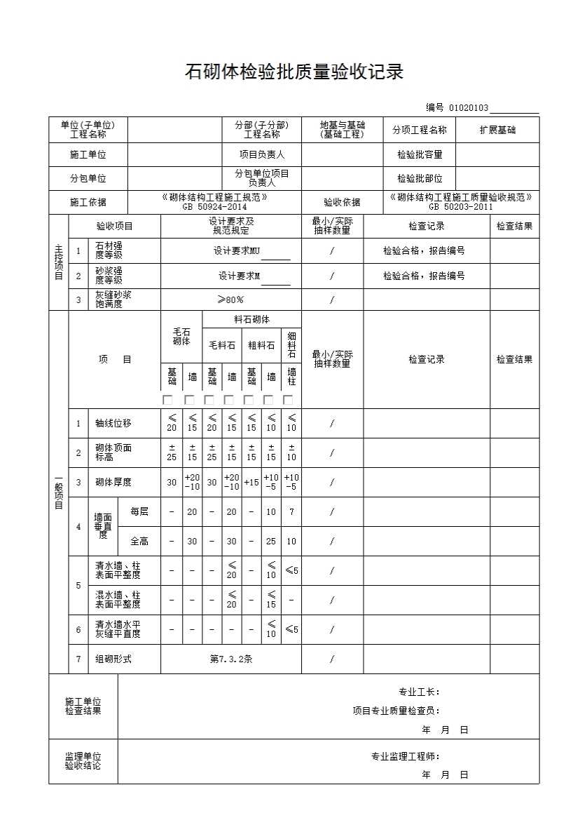 7.3.1 石砌体尺寸、位置的允许偏差及检验方法应符合表7. 3. 1的规定。