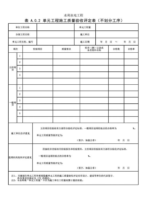 表 A.0.2 单元工程施工质量验收评定表(不划分工序)