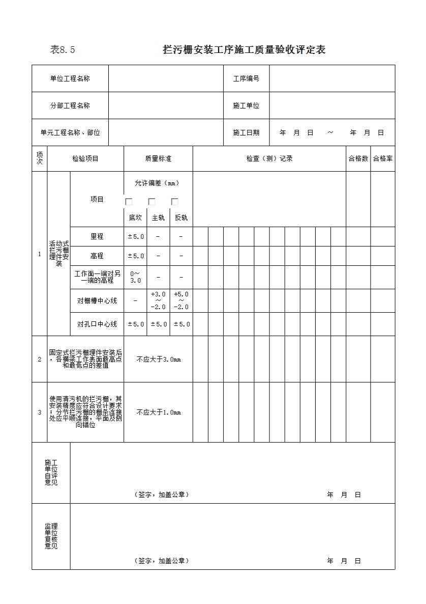 表格名称:8.5 拦污栅安装工序施工质量验收评定表