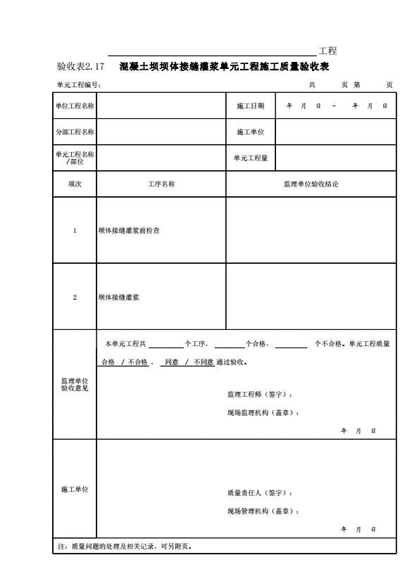 表格名称:表2.17 混凝土坝坝体接缝灌浆单元工程施工质量验收表