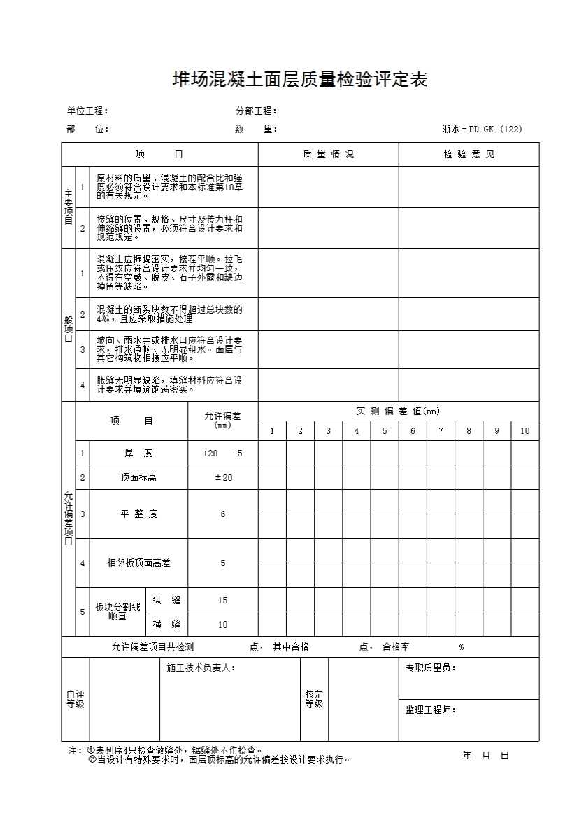 表格名称:122 堆场混凝土面层质量检验评定表