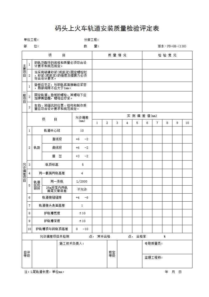 表格名称:130 码头上火车轨道安装质量检验评定表
