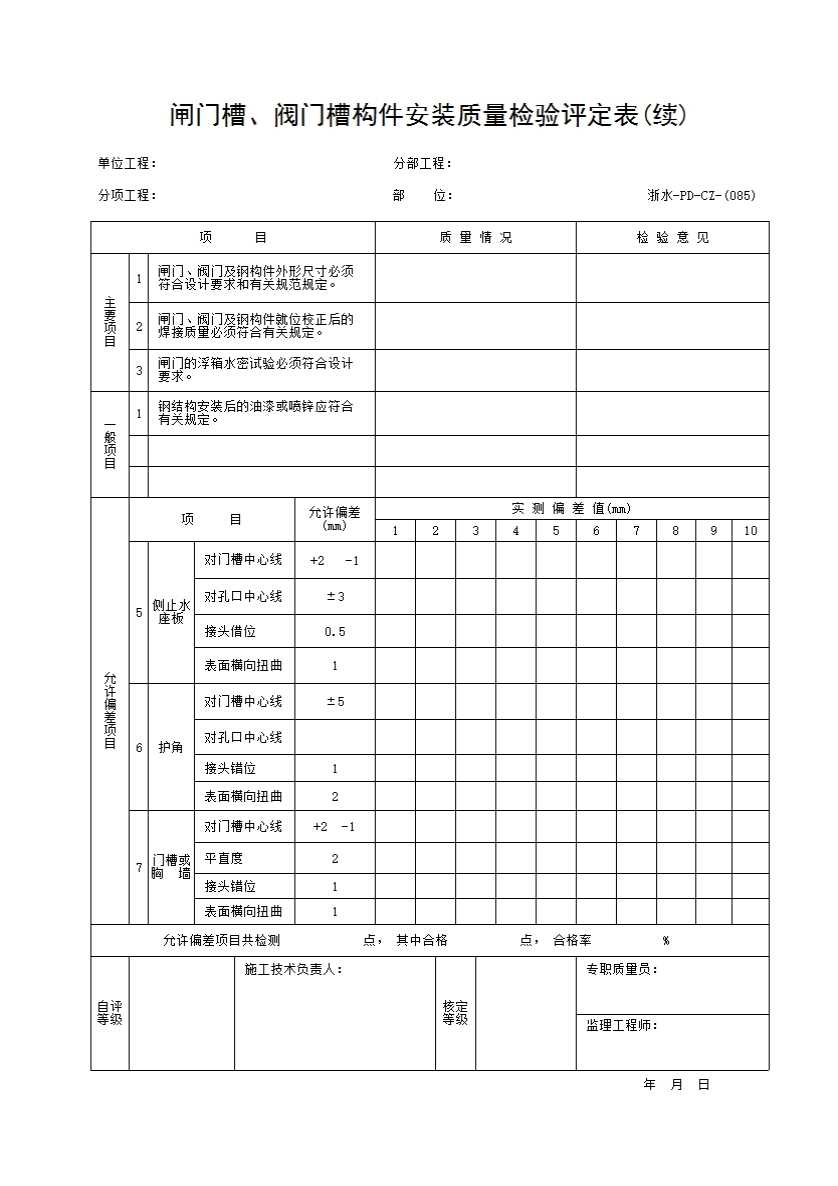 表格名称:085 闸门槽、阀门槽构件安装质量检验评定表(续)