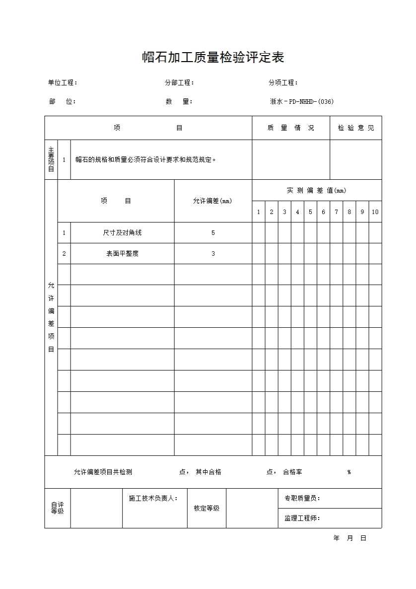 表格名称:036 帽石加工质量检验评定表