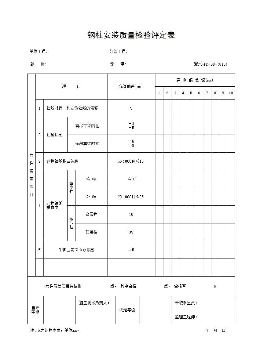 表格名称:015 钢柱安装质量检验评定表