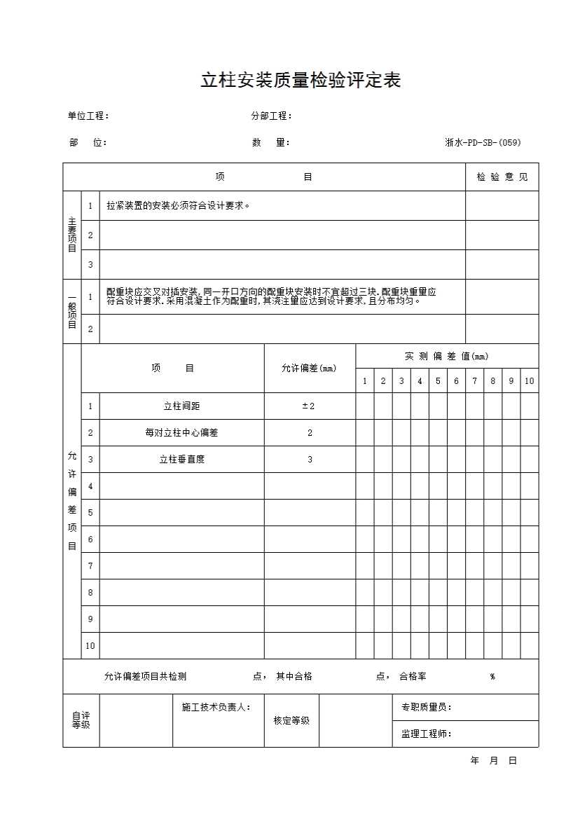 表格名称:059 立柱安装质量检验评定表