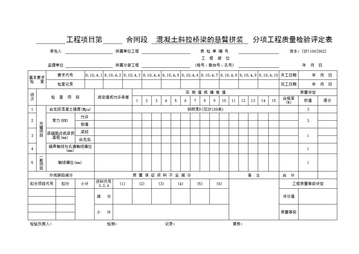 表格名称:062 混凝土斜拉桥梁的悬臂拼装分项工程质量检验评定表