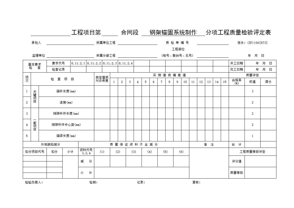 表格名称:073 钢架锚固系统制作分项工程质量检验评定表
