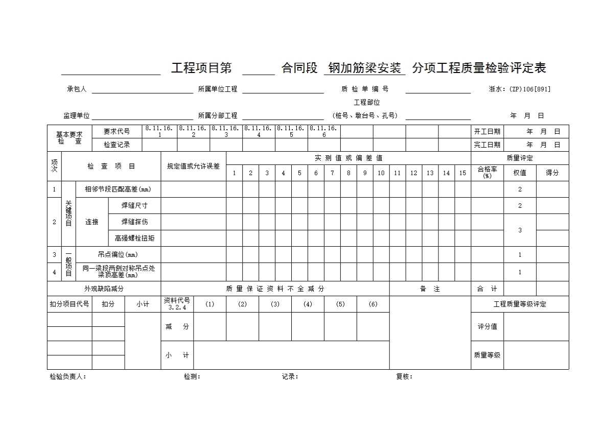 表格名称:091 钢加筋梁安装分项工程质量检验评定表