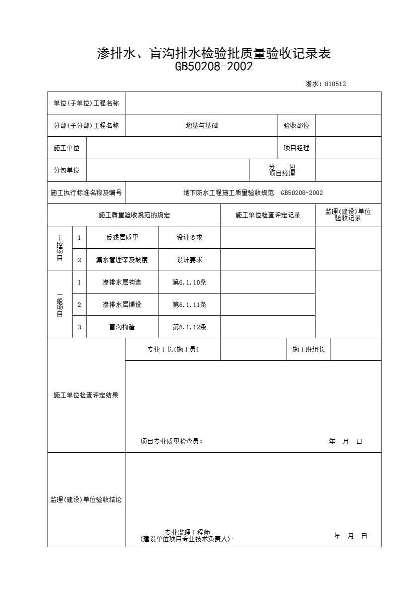 表格名称:044 渗排水、盲沟排水检验批质量验收记录表