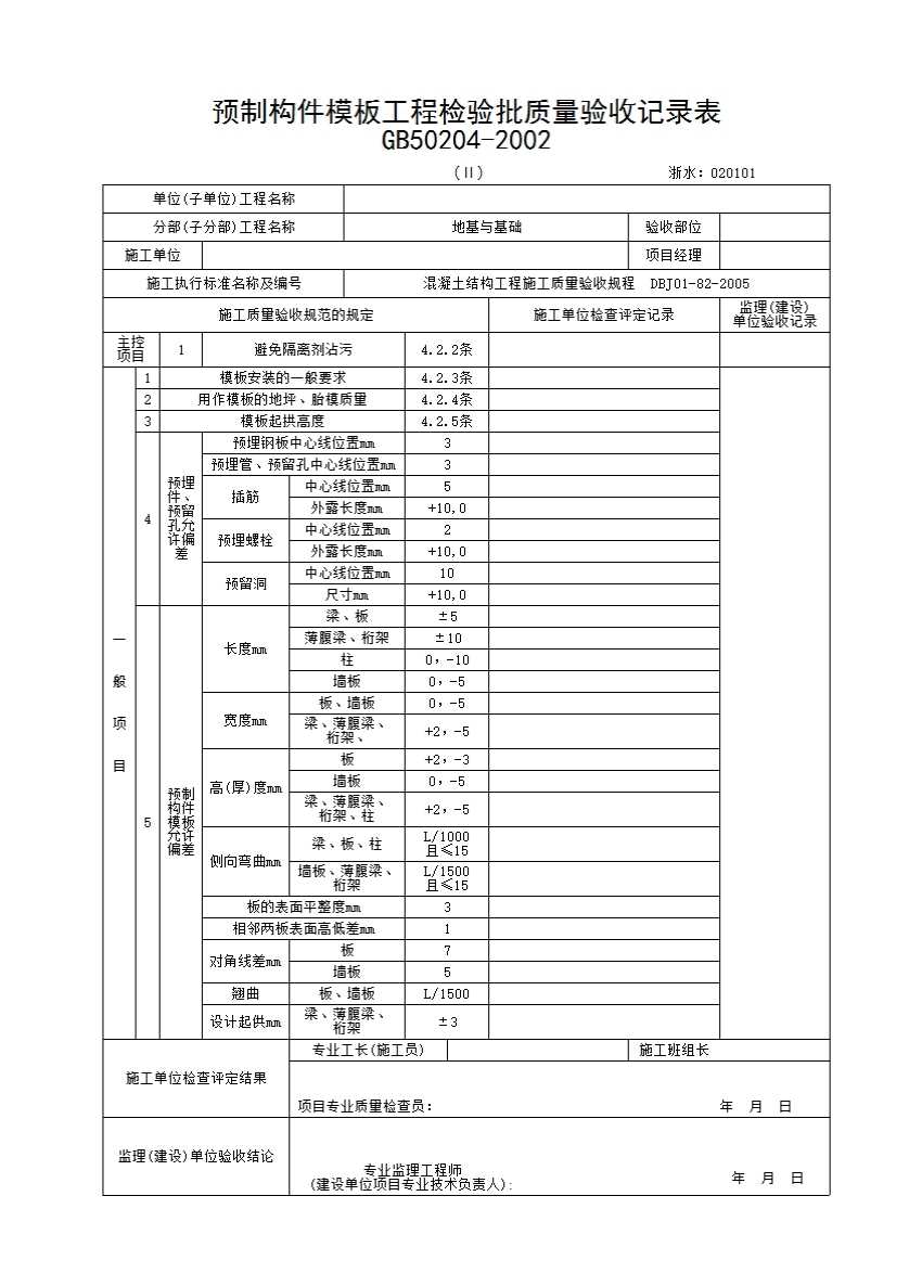 表格名称:049 预制构件模板工程检验批质量验收记录表(II)