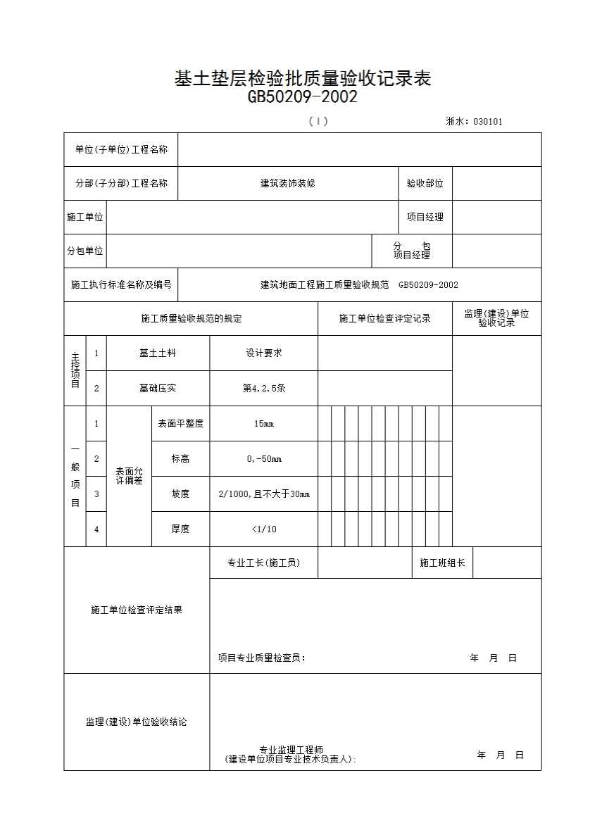 表格名称:087 基土垫层检验批质量验收记录表(I)