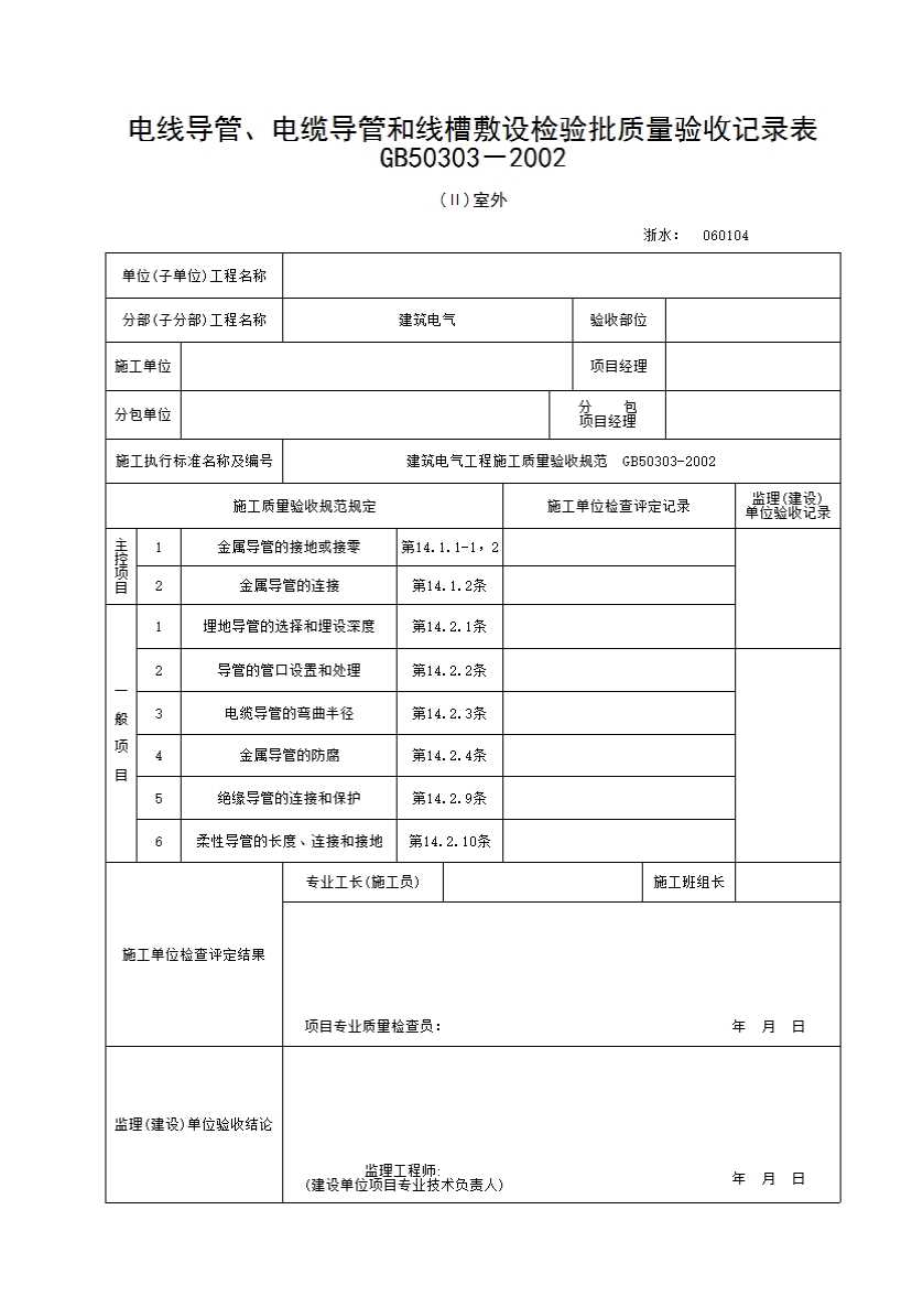 表格名称:197 电线导管、电缆导管和线槽敷设检验批质量验收记录表(II)室外