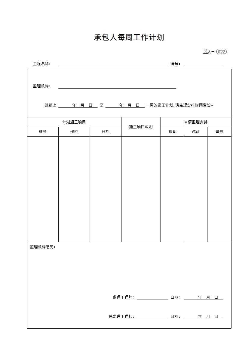 表格名称:022 承包人每周工作计划