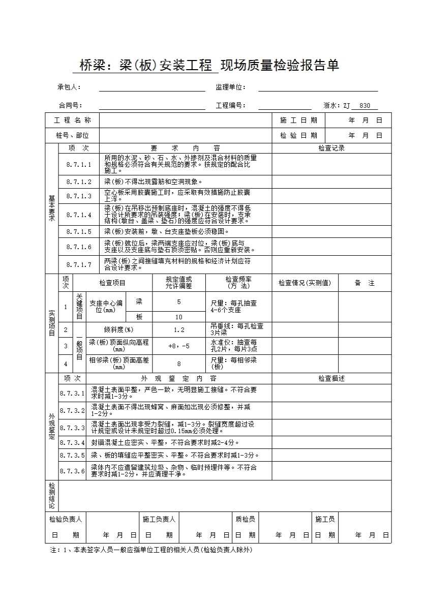 表格名称:浙水:ZJ830 桥梁:梁(板)安装工程现场质量检验报告单
