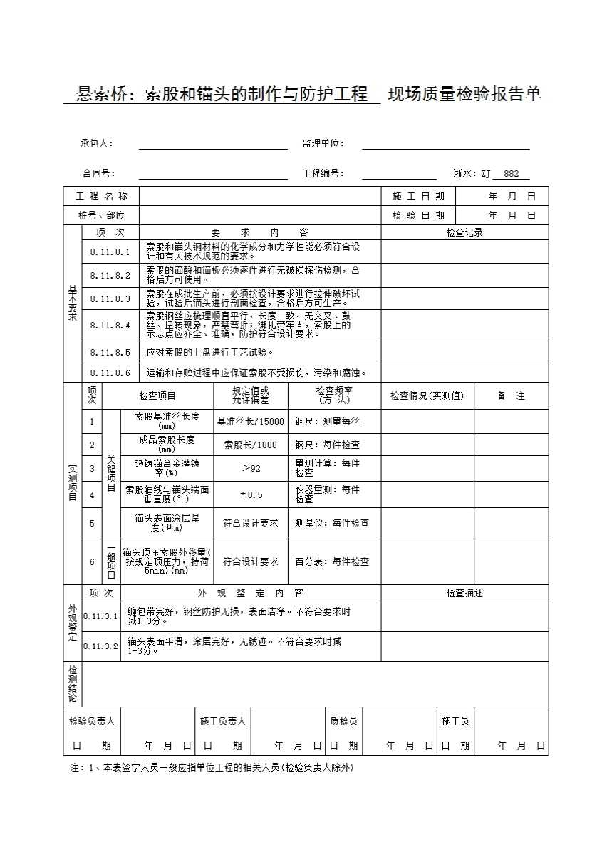 表格名称:浙水:ZJ882 悬索桥:索股和锚头的制作与防护工程现场质量检验报告单