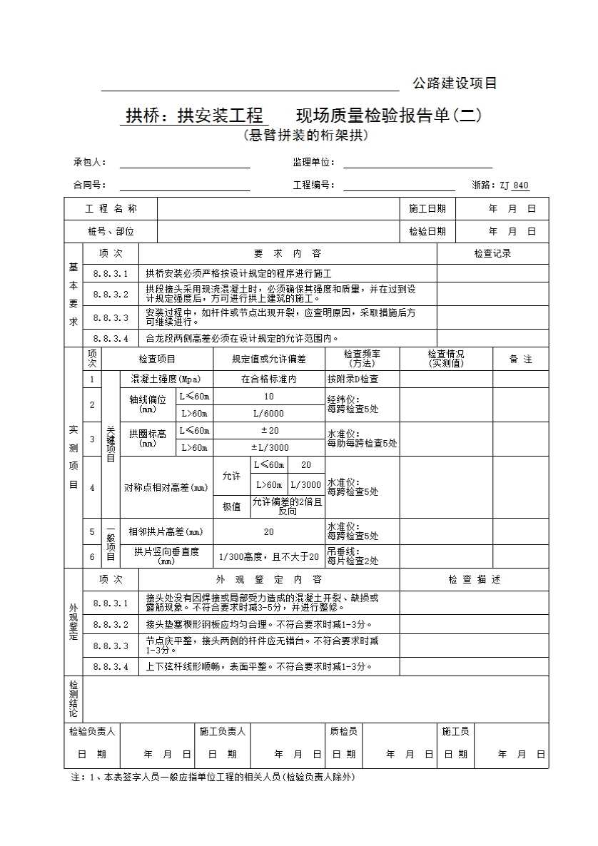表格名称:浙路ZJ840 拱桥:拱安装工程现场质量检验报告单(二)