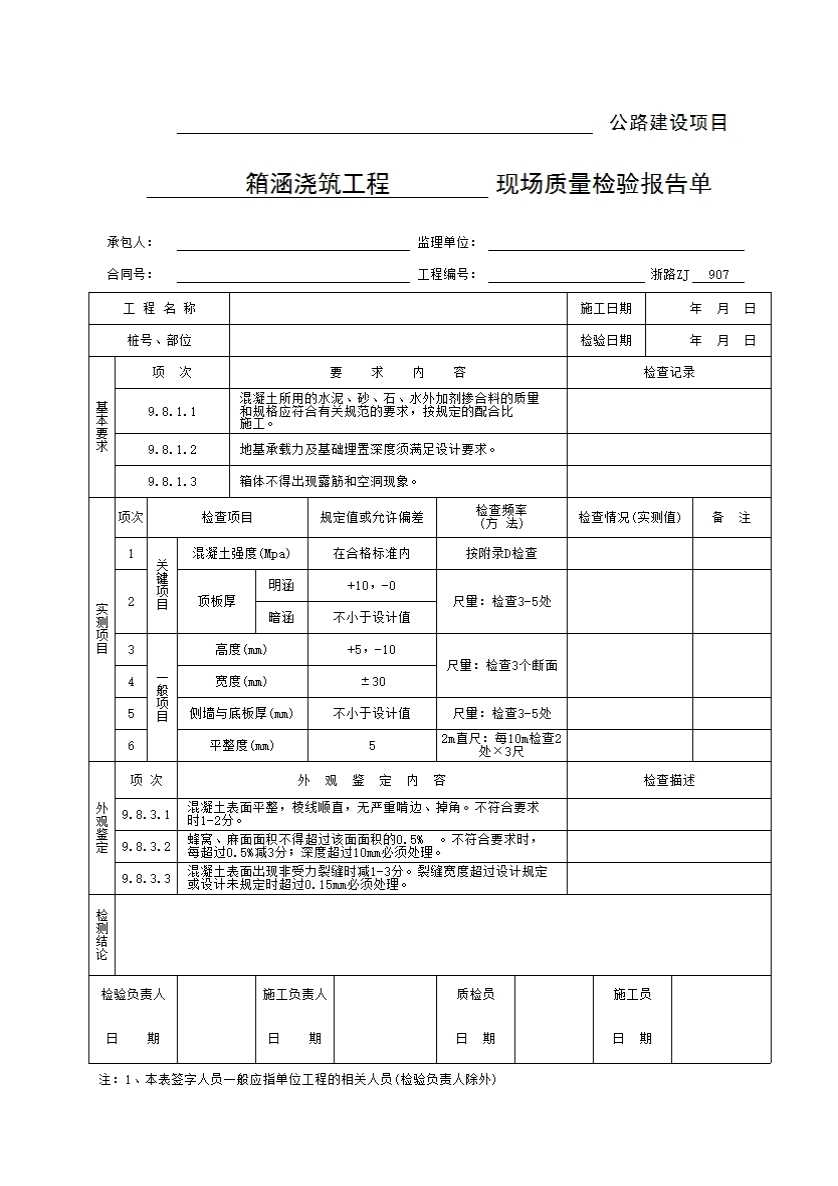 浙路ZJ907 箱涵浇筑工程现场质量检验报告单