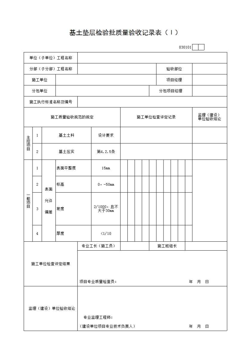 表格名称:030101 基土垫层检验批质量验收记录表(Ⅰ)