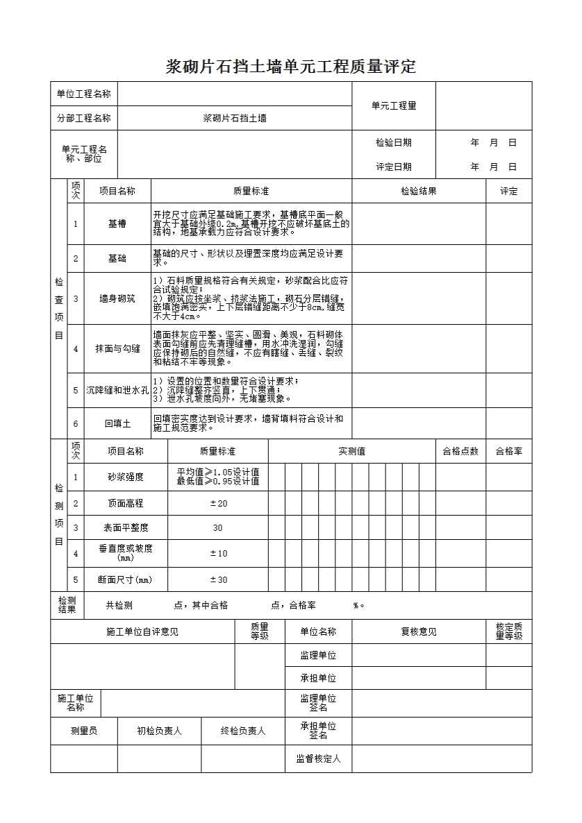 表格名称:浆砌石挡土墙单元工程质量评定
