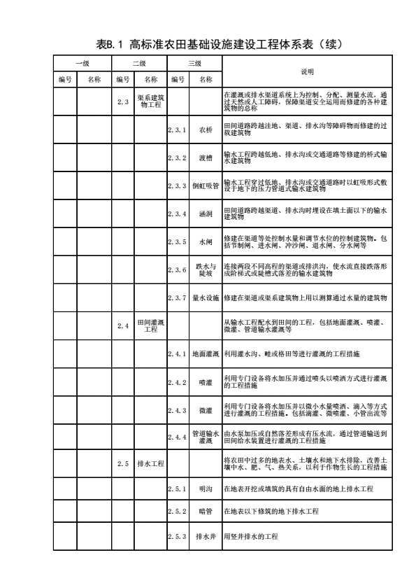 表格名称:表B.1 高标准农田基础设施建设工程体系表