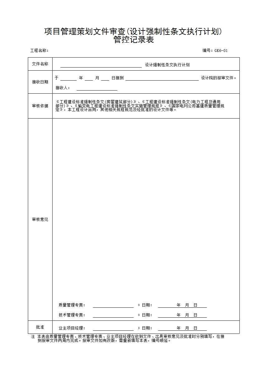 项目管理策划文件审查(设计强制性条文执行计划)管控记录表